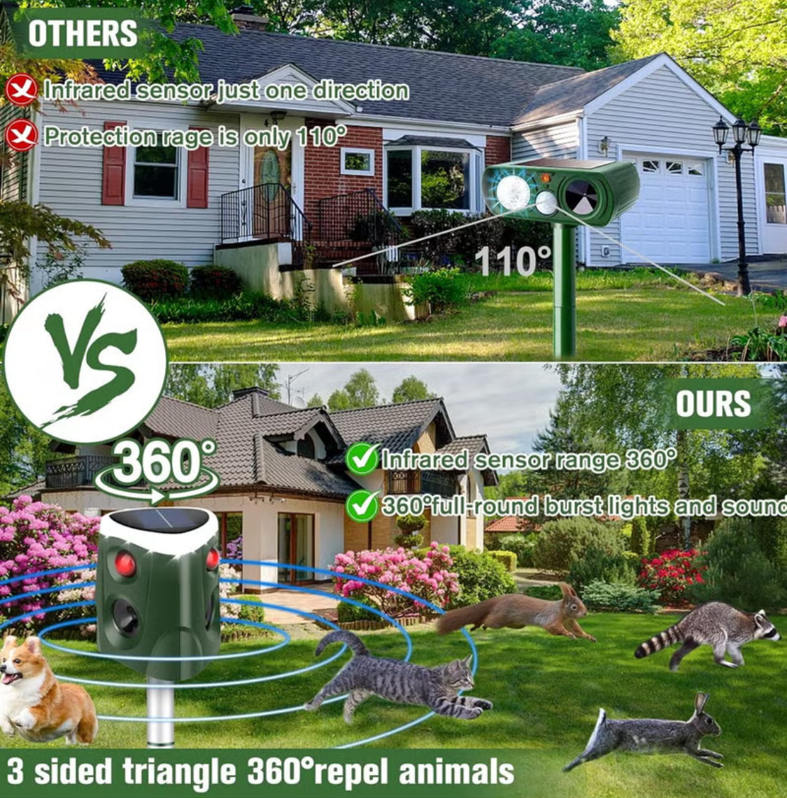 - طارد حيوانات يعمل بالطاقة الشمسية 360 درجة⚡ يستخدم طارد الحيوانات بالموجات فوق الصوتية الذي يعمل بالطاقة الشمسية تقنية الموجات فوق الصوتية الأكثر تقدمًا لتوليد موجات فوق صوتية قوية (13.5 كيلو هرتز - 65 كيلو هرتز)، مصحوبة بأصوات صفارات الإنذار ووميض مكثف بلونين 360 درجة. يحتوي طارد الكلاب على مستشعرات مدمجة للكشف عن الحركة بالأشعة تحت الحمراء عالية الحساسية، والتي سوف تكتشف المتسللين من خلال مستشعرات الأشعة تحت الحمراء وتنشط نظام الموجات فوق الصوتية، مما يؤدي بزاوية 360 درجة ونطاق مسافة 26-33 قدمًا للحصول على الأداء الأمثل.