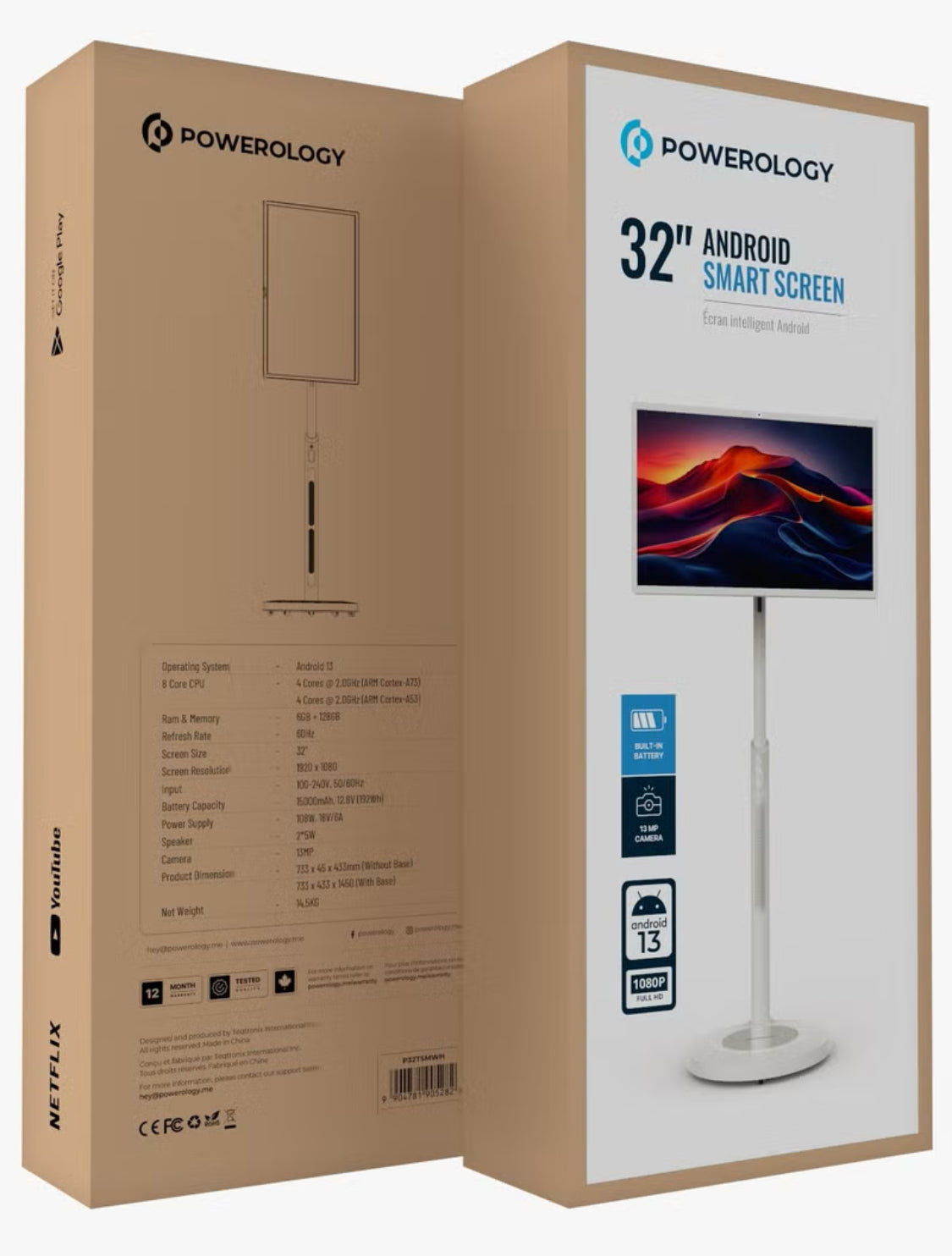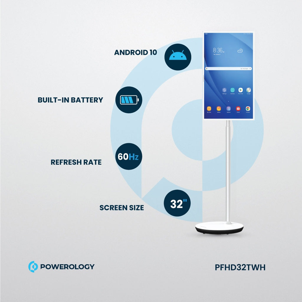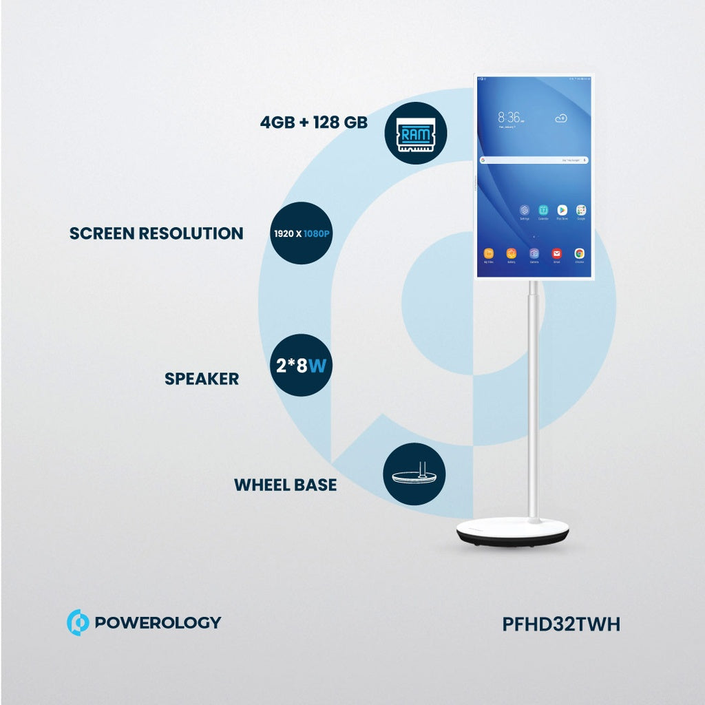 شاشة ذكية تعمل بنظام أندرويد مقاس 32 بوصة مع حامل وكاميرا / نتفليكس / يوتيوب / جوجل بلاي / شاشة عالية الدقة 1080 بكسل / شاشة تعمل باللمس تعمل بنظام أندرويد / قابلة لإعادة الشحن / شاشة ذكية بوظيفة تشبه الجهاز اللوحي - أبيض