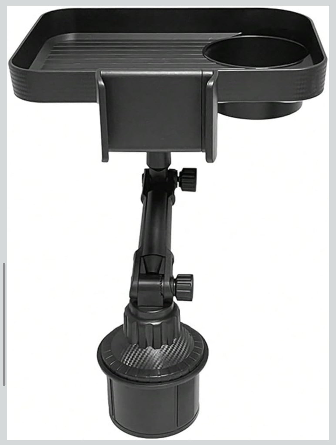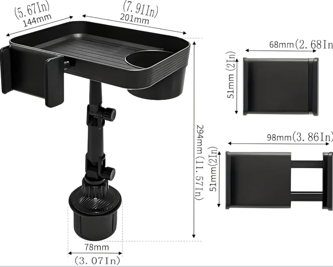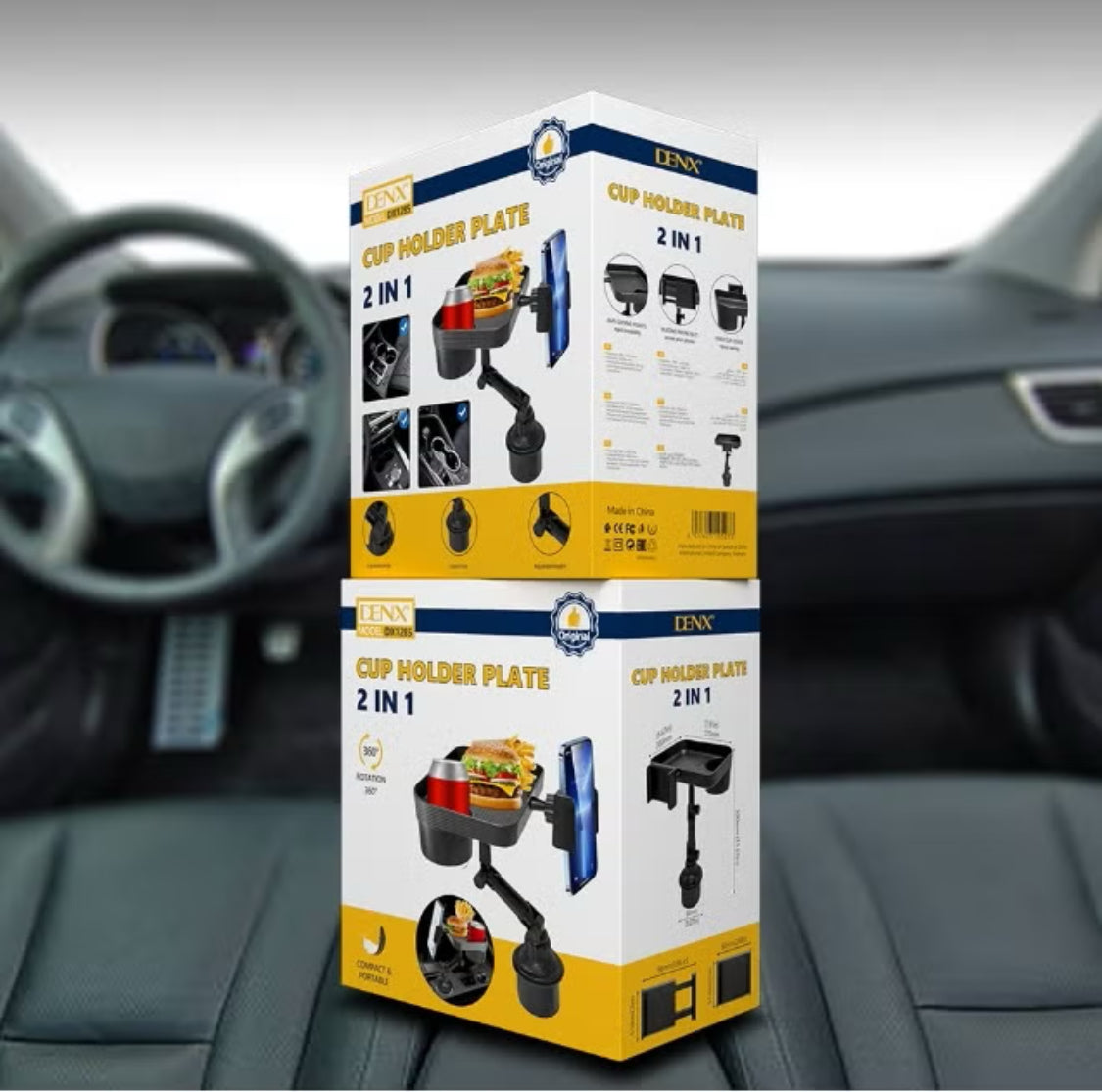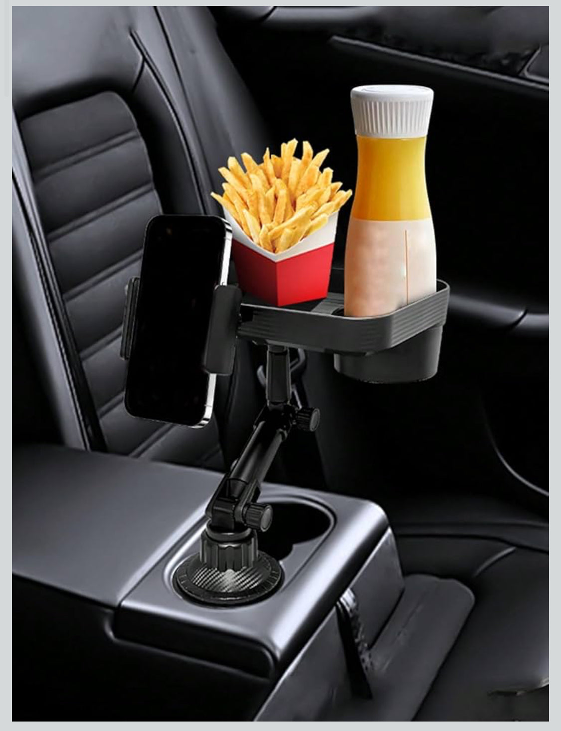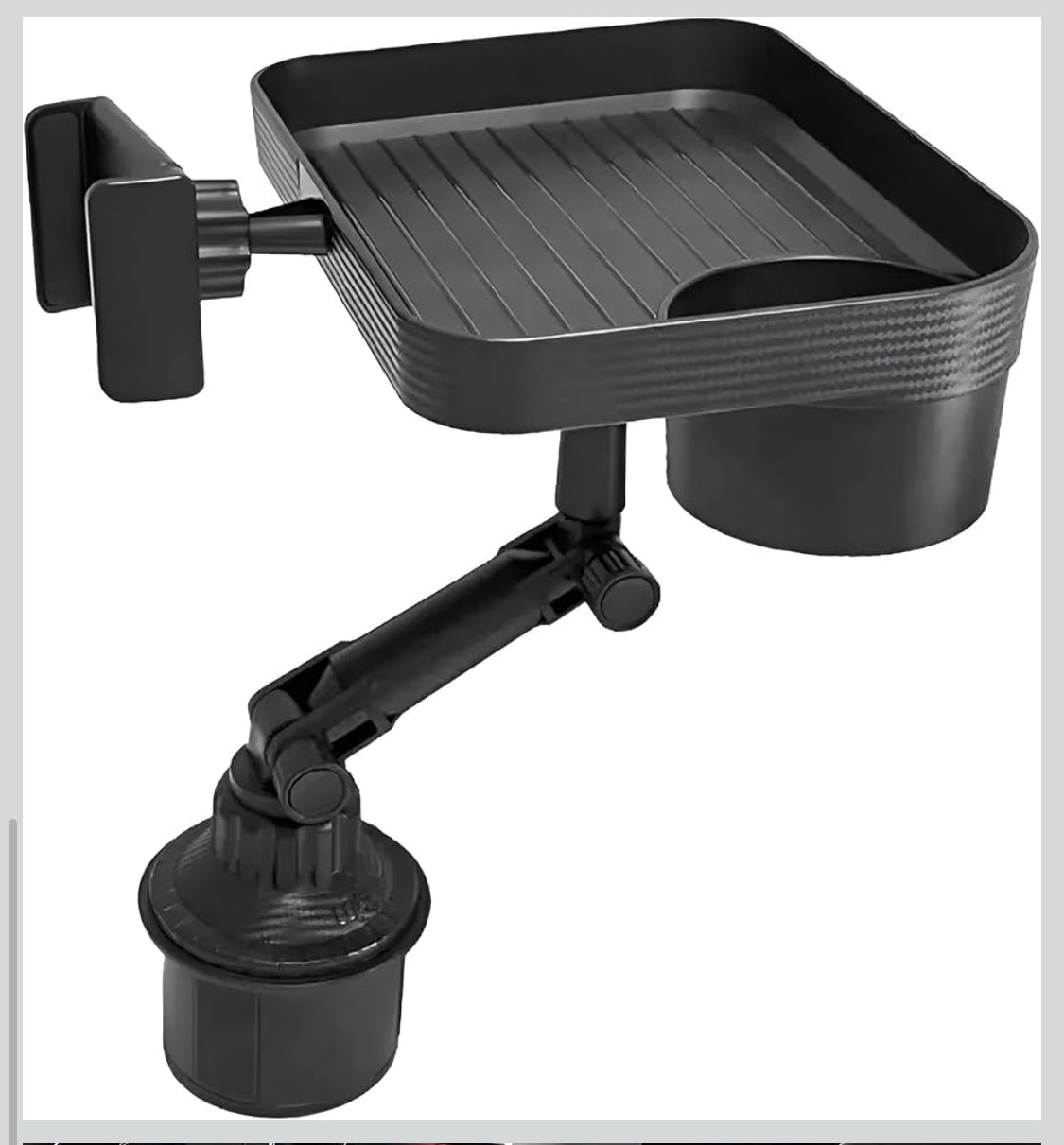 تصميم عملي يجمع صينية طعام متعددة الأقسام وحامل هاتف مدمج لراحة أثناء القيادة.