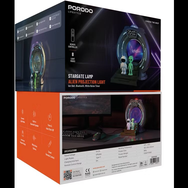 مصباح Porodo Lifestyle Stargate مع ضوء الإسقاط الغريب، 8 أوضاع الضوء، جهاز التحكم عن بعد، مكبر صوت بلوتوث مدمج، مؤقت وإيقاف التشغيل التلقائي، خيارات الضوضاء البيضاء، شحن من النوع C - رمادي.